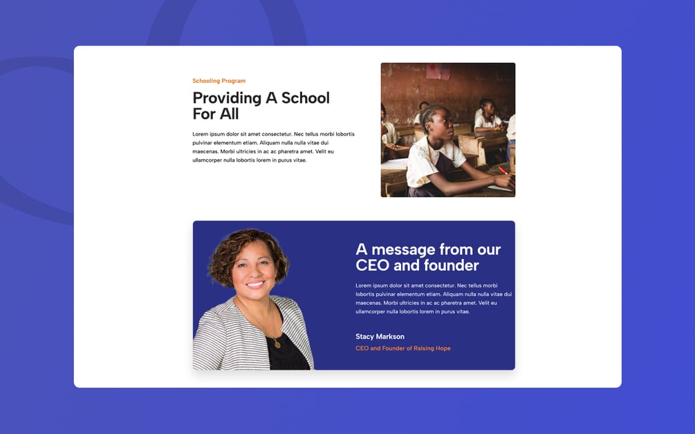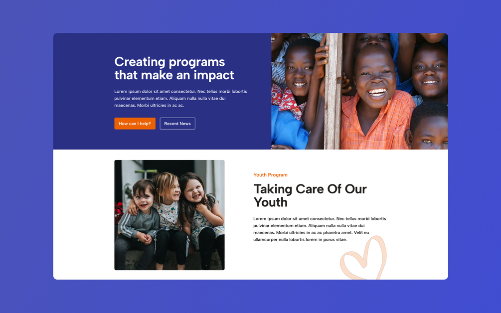 A non-profit website template created in Webflow with a positive, passionate, upbeat feeling. Great for any non-profit looking to share its story and what they do.